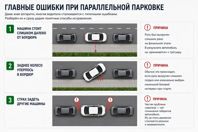 Даже зная алгоритм, многие водители сталкиваются с типичными ошибками. Разберём их и сразу дадим понятные способы исправления.