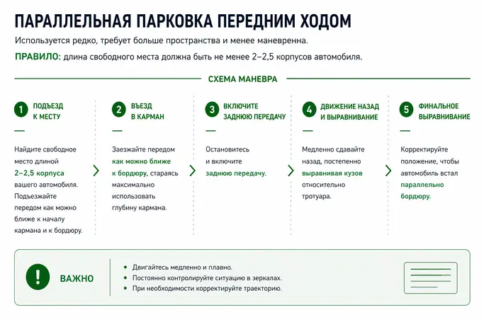 ❗️Такой способ редко применим в городе: в плотном потоке почти невозможно найти достаточно места. Поэтому главный совет — освоить классический вариант задним ходом, если хотите уверенно понимать, как правильно парковаться вдоль бордюра.