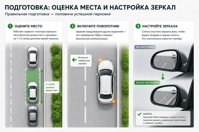 Перед тем как парковать авто, важно правильно оценить место. Работает простое правило «полтора корпуса»: пространство должно быть примерно на 1–1,2 метра длиннее вашей машины — иначе велик риск, что возникнет ошибка при параллельной парковке еще на этапе заезда. Заранее включите поворотник, чтобы предупредить других водителей — это требование ПДД и элемент безопасной коммуникации. Перед маневром настройте зеркала: их можно слегка опустить вниз, чтобы лучше видеть бордюр и заднее колесо. Это значительно упрощает понимание, как правильно парковаться параллельно бордюру, особенно для новичко