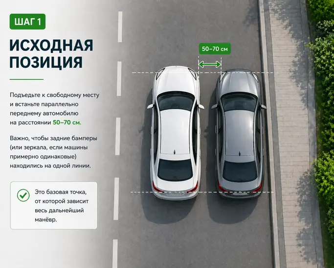 Двигайтесь к свободному месту и встаньте параллельно переднему автомобилю на расстоянии 50–70 см. Важно, чтобы задние бамперы (или зеркала, если машины примерно одинаковые) находились на одной линии. Это базовая точка, от которой зависит весь дальнейший маневр.