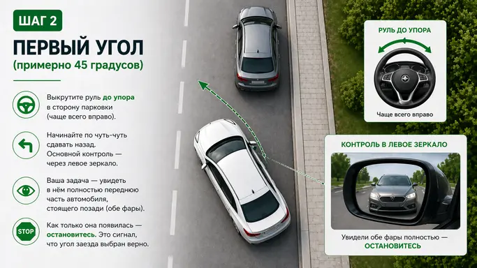Выкрутите руль до упора в сторону парковки (чаще всего вправо) и начинайте по чуть-чуть сдавать назад. Основной контроль — через левое зеркало. Ваша задача — увидеть в нём полностью переднюю часть автомобиля, стоящего позади (обе фары). Как только она появилась — остановитесь. Это сигнал, что угол заезда выбран верно.