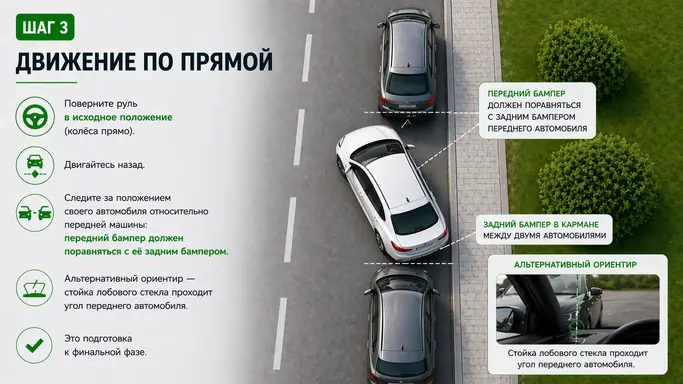 Поверните руль в исходное положение (колёса прямо) и двигайтесь назад. Следите за положением своего автомобиля относительно передней машины: передний бампер должен поравняться с ее задним бампером. Альтернативный ориентир — стойка лобового стекла проходит угол переднего автомобиля. Это подготовка к финальной фазе.