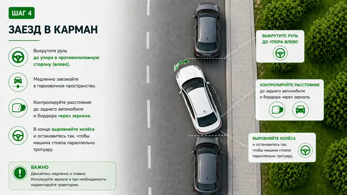 Решение: аккуратно выезжаете вперёд или назад, затем сдаете назад с прямыми колесами чуть глубже и повторяете финальный поворот руля — это поможет поставить машину ближе.